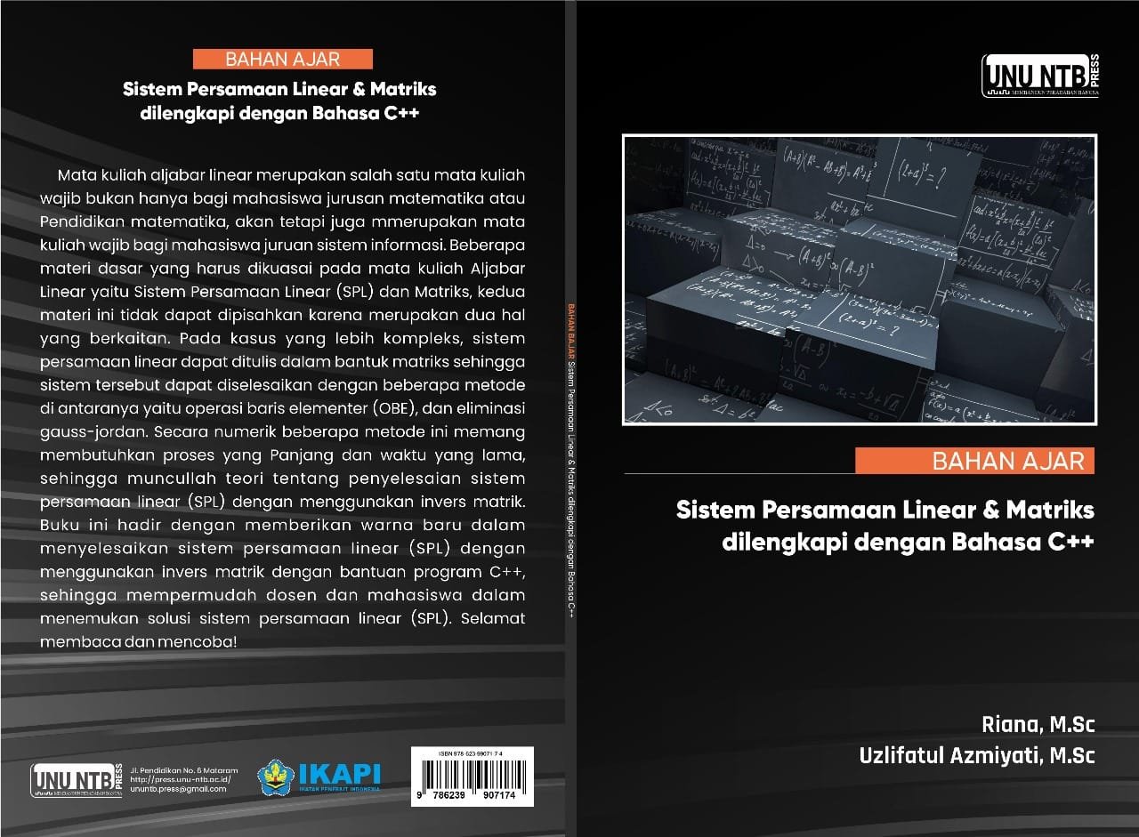 Mata kuliah aljabar linear merupakan salah satu mata kuliah wajib bukan hanya bagi mahasiswa jurusan matematika atau Pendidikan matematika, akan tetapi juga mmerupakan mata kuliah wajib bagi mahasiswa juruan sistem informasi. Beberapa materi dasar yang harus dikuasai pada mata kuliah Aljabar Linear yaitu Sistem Persamaan Linear (SPL) dan Matriks, kedua materi ini tidak dapat dipisahkan karena merupakan dua hal yang berkaitan. Pada kasus yang lebih kompleks, sistem persamaan linear dapat ditulis dalam bantuk matriks sehingga sistem tersebut dapat diselesaikan dengan beberapa metode di antaranya yaitu operasi baris elementer (OBE), dan eliminasi gauss-jordan. Secara numerik beberapa metode ini memang membutuhkan proses yang Panjang dan waktu yang lama, sehingga muncullah teori tentang penyelesaian sistem persamaan linear (SPL) dengan menggunakan invers matrik. Buku ini hadir dengan memberikan warna baru dalam menyelesaikan sistem persamaan linear (SPL) dengan menggunakan invers matrik dengan bantuan program C++, sehingga mempermudah dosen dan mahasiswa dalam menemukan solusi sistem persamaan linear (SPL). Selamat membaca dan mencoba!